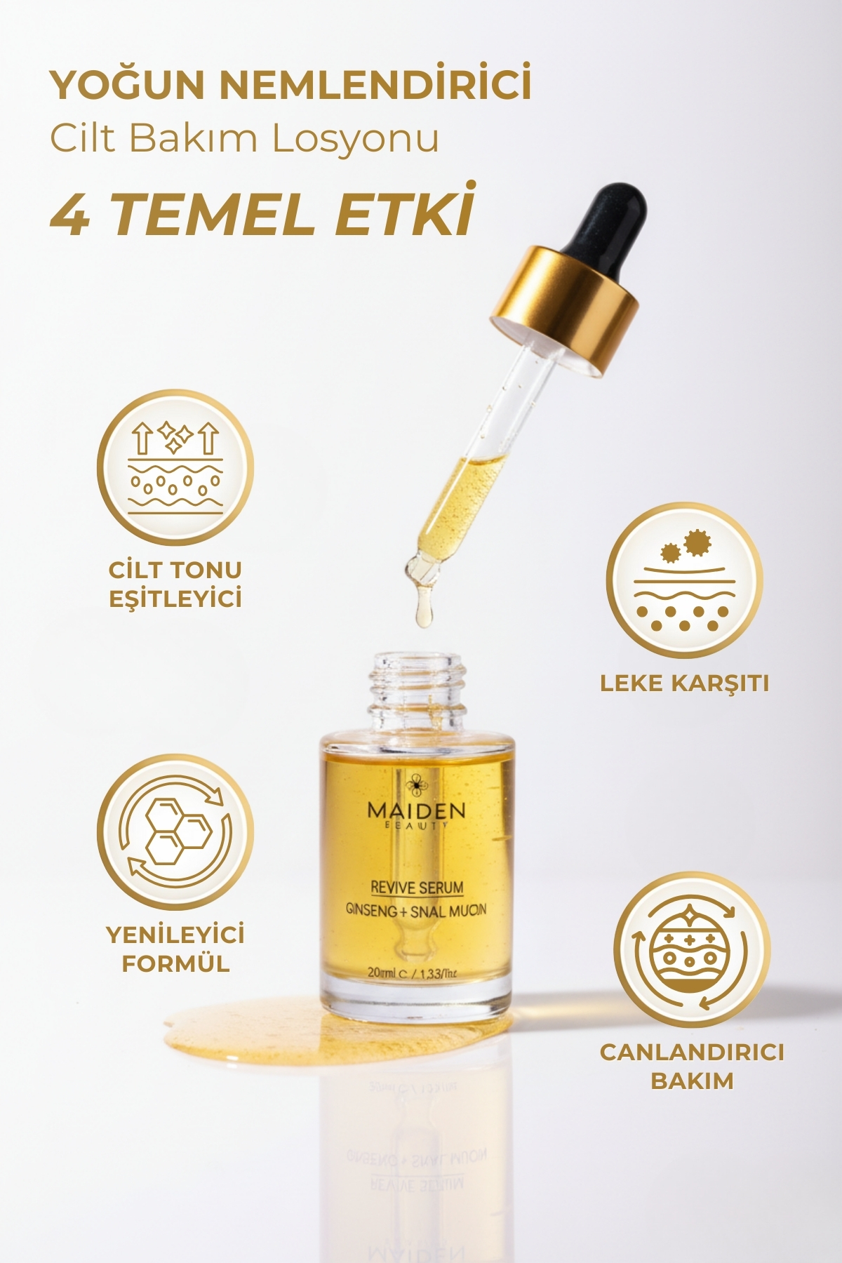 “Maiden Beauty Revive Serum: Ginseng’in enerjisi ve salyangoz özünün yenileyici gücüyle cildinize hayat verin. Daha canlı, esnek ve parlak bir cilt için kusursuz bir bakım.”