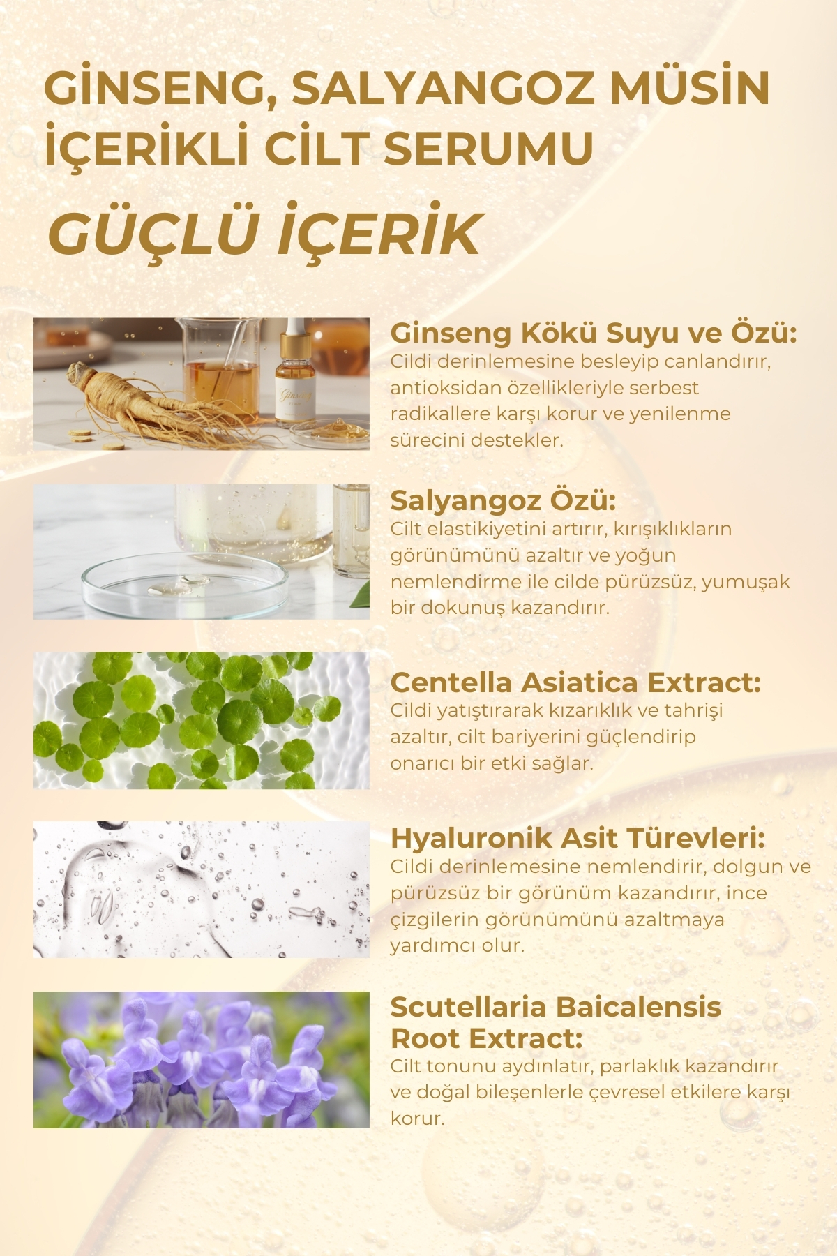 Yoğun Nemlendirme: Hyaluronik asit türevleri ve salyangoz özüyle cildi derinlemesine nemlendirir.
